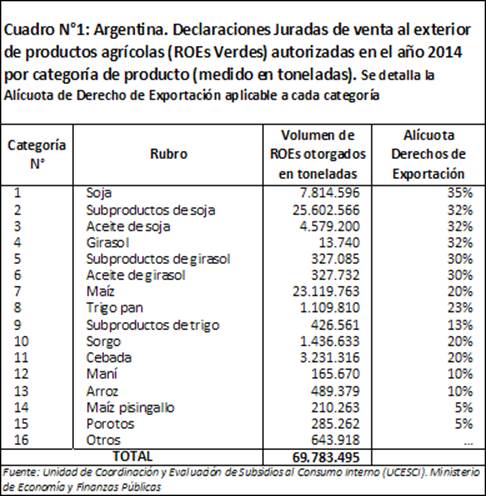 a) Se procedió en primer lugar a agrupar las autorizaciones de ROEs Verdes (Declaraciones Juradas de Venta al exterior de productos agrícolas) del año 2014 en 16 categorías diferentes. Ellas son: soja, subproductos de soja (harinas y pellets), aceite de soja, girasol, subproductos de girasol, aceite de girasol, maíz, trigo pan, subproductos de trigo, sorgo, cebada, maní, arroz, maíz pisingallo, porotos y otros. Los resultados obtenidos se detallan en el cuadro N°1.