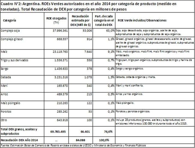 e) Luego de haber obtenido los DEX por cada ROE se procedió a recategorizar en 11 rubros: Complejo Soja, Complejo Girasol, maíz, trigo y sus derivados, sorgo, cebada, maní, arroz, maíz pisingallo, porotos y otros. En esta última categoría (otros) se incluyeron emisiones de ROE Verde sobre 28 productos que para el total del año 2014 acumularon un volumen inferior a 100.000 toneladas cada uno. El aporte fiscal de estas ventas externas, cuyos permisos concedidos por UCESCI totalizaron 643.918 toneladas, se estimó en una suma equivalente a $ 100 millones de pesos en concepto de DEX.