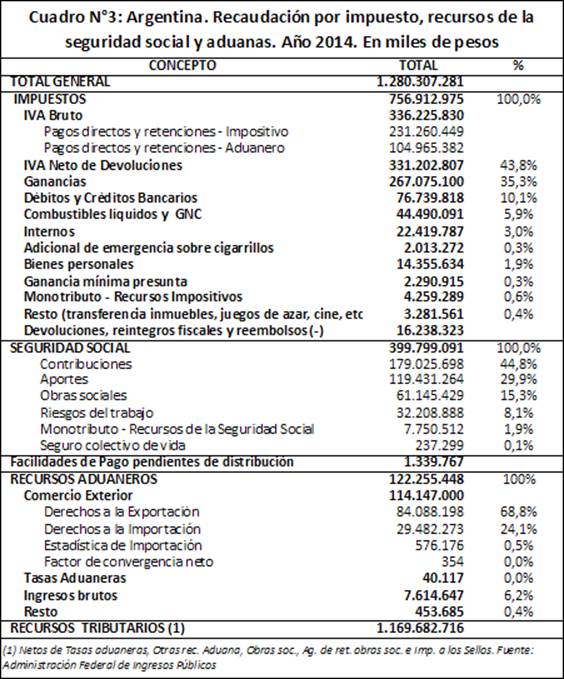 h) Finalmente comparamos los DEX que paga el campo y la agroindustria con la recaudación del Gobierno Nacional en el año 2014. Conforme al cuadro N°3, el Gobierno Nacional recaudó 1.280.307 millones de pesos el año pasado. Esta recaudación esta compuesta por: a) Impuestos con un total de 756.912 millones de pesos, b) Aportes y contribuciones a la seguridad social donde se recaudó 399.799 millones de pesos y c) Recursos aduaneros con ingresos por 122.255 millones de pesos. Precisamente en esta categoría se encuentran los Derechos de Exportación que según AFIP contribuyeron a la recaudación total con 84.088 millones de pesos. Según nuestras estimaciones, la producción de granos, aceites, harinas y subproductos habría aportado 64.401 millones de pesos en el 2014 en concepto de Derechos de Exportación.