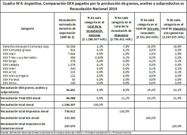 - En el año 2014 la recaudación total de Derechos de Exportación en la República Argentina ascendió a 84.088 millones de pesos. El campo y la agroindustria habrían contribuido con aproximadamente 64.400 millones de pesos, un 76,6% del total. Hay otros rubros que pagan derechos de exportación pero que no son productos que provengan del reino vegetal o la agroindustria. Es el caso de los productos minerales, los de las industrias químicas o petroleras, material de transporte, productos del reino animal, etc. Estos rubros aportarían el 23,4% restante de los DEX nacionales, es decir 19.687 millones de pesos. Como puede verse, su aporte es muy inferior al de los granos y la agroindustria argentina.
