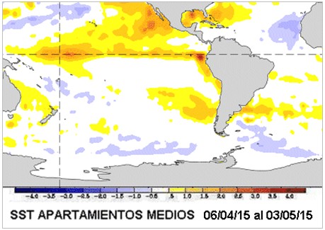 Durante las últimas dos semanas del pasado mes se apreció una anomalía positiva de un grado centígrado en vastos sectores de la cuenca del Pacífico Ecuatorial. Esto implica que las anomalías de temperatura confirman el retorno del indicador ENSO hacia una posición El Niño, por el momento débil pero que posiblemente se mantenga durante gran parte del año.