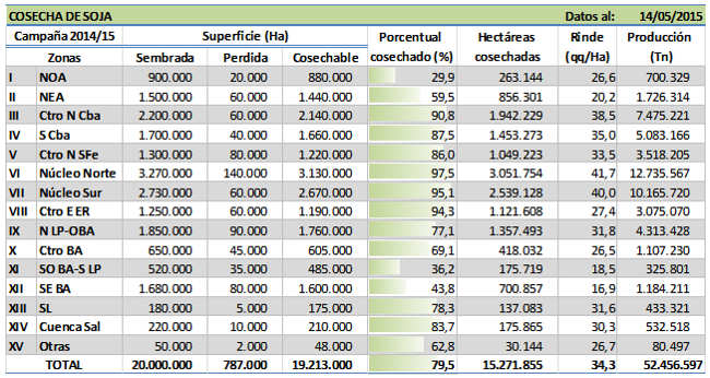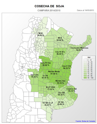Próxima a finalizar la cosecha en las zonas núcleo, la actividad ahora se concentra en regiones periféricas. Al presente informe se estima que la recolección cubrió el 79,5 % del superficie apta en toda el área agrícola, permitiendo calcular un progreso intersemanal de 10,9 puntos porcentuales explicado por las buenas condiciones climáticas de los días previos. En números absolutos, luego de recolectarse más de 15 MHa el rinde medio nacional cayó a 34,3 qq/Ha y el volumen parcial acumulado ya supera las 52 MTn. Bajo este escenario mantenemos nuestra proyección al cierre del ciclo en 60.000.000 de toneladas.
