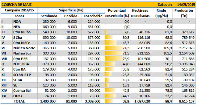 A pesar de las buenas condiciones climáticas relevadas durante los días previos, la recolección de maíz con destino grano comercial continúa avanzando lentamente. Al presente informe se estima que la superficie cosechada cubrió el 32,9 % del área apta, cifra que equivale a más de 1 MHa ya recolectadas. El rinde medio nacional ascendió a 88,4 qq/Ha y debido a ello el volumen parcial acumulado alcanzó las 9,6 MTn. Bajo este escenario mantenemos nuestra proyección de producción al cierre del ciclo en 25.000.000 de toneladas.