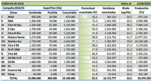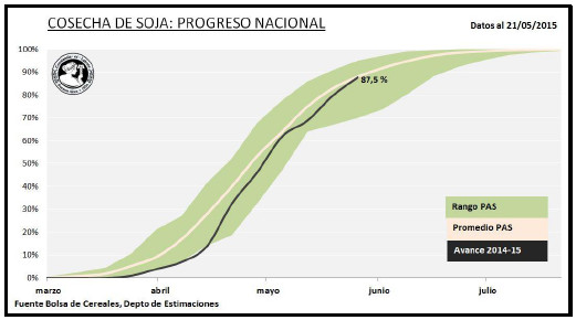 La recolección de cuadros está próxima a finalizar sobre el centro de la región agrícola, más precisamente en las provincias de Córdoba, Santa Fe y Entre Ríos. La actividad ahora se concentrando sobre las regiones del norte y del sur, y el importante adelanto interanual de la cosecha nacional se debe a fuertes lluvias registradas durante estas misma fechas del ciclo previó, que provocaban continuas interrupciones y frenaban el avance de las cosechadoras en Buenos Aires y en las regiones NOA y NEA.