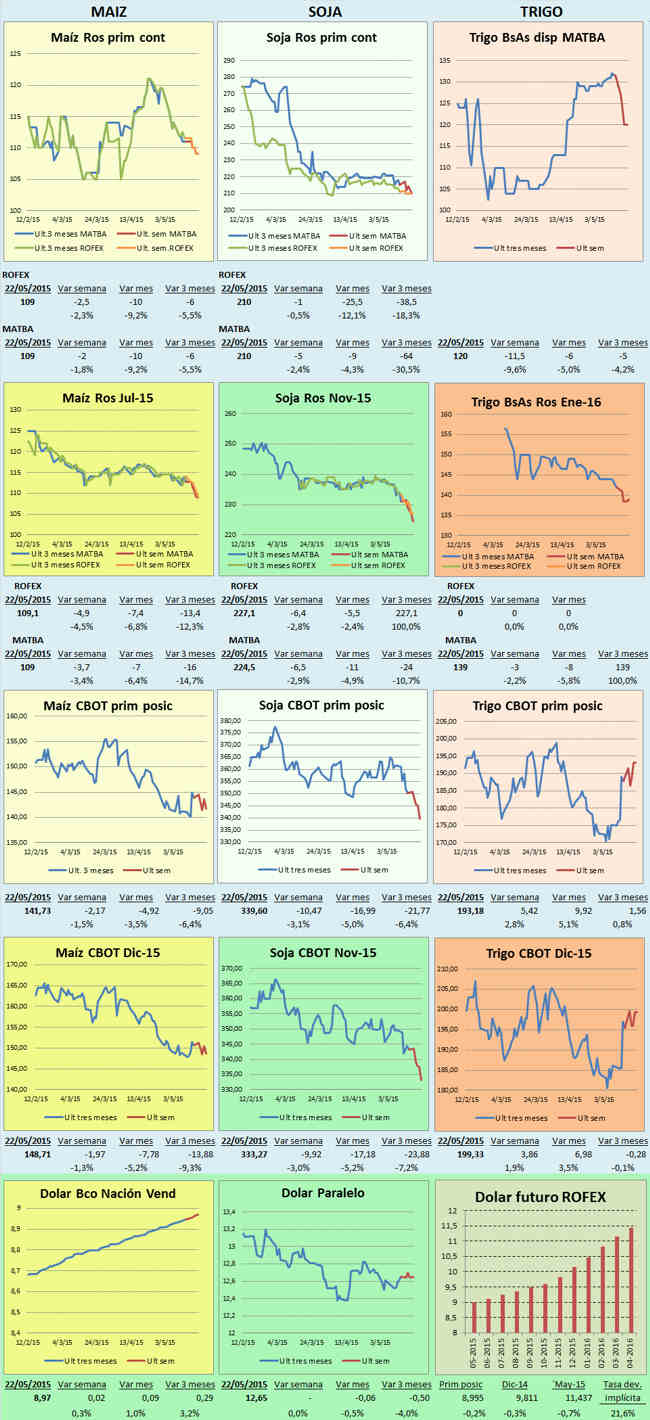 En el caso del trigo, luego de que el mercado se calentara por las lluvias en EEUU y dudas sobre Australia, esta semana nos enteramos que la calidad de cultivos de trigo de invierno de EEUU se mantuvo en 45% buena a excelente contra 30% del año anterior. En tanto el trigo primavera recibió una calificación buena a excelente de 69% contra 65% del año anterior. Otro factor negativo para el trigo en Chicago es que el dólar volvió a revaluarse, generando que pierda competitivos frente a otros exportadores, como Europa y Rusia. Por ello el precio baja para seguir tentando a compradores con menor poder adquisitivo medido en dólares.