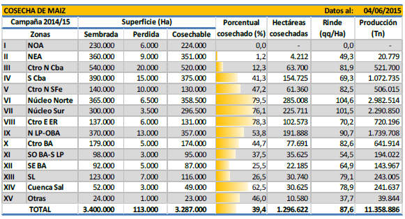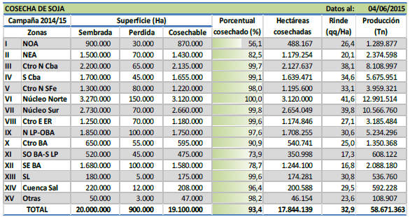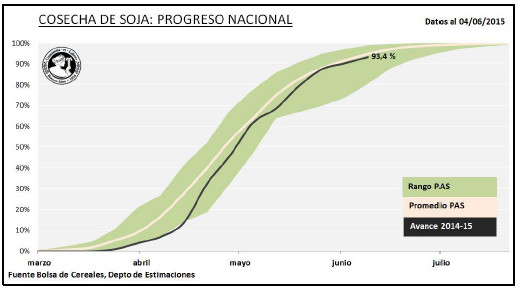 Durante los últimos quince días las condiciones climáticas favorecieron el avance de las cosechadoras sobre la mayor parte de la franja central del país. Gracias a esto último en el informe previo se daba por finalizada la recolección sobre la región Núcleo Norte, mientras que a la fecha se estima que la cosecha avanzó por sobre el 98 % de la superficie apta en las zonas Centro-Norte y Sur de Córdoba, Centro-Norte de Santa Fe, Centro-Este de Entre Ríos y el Núcleo Sur.