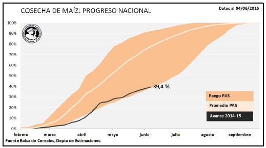 La recolección de maíz con destino grano comercial cubrió el 39,4 % de la superficie apta, registrando un rendimiento promedio de 87,6 qq/Ha, permitiendo acumular un volumen parcial próximo a las 11,4 MTn. El avance intersemanal fue de 2 puntos porcentuales, concentrándose fundamentalmente sobre el centro-sur del área agrícola nacional.
