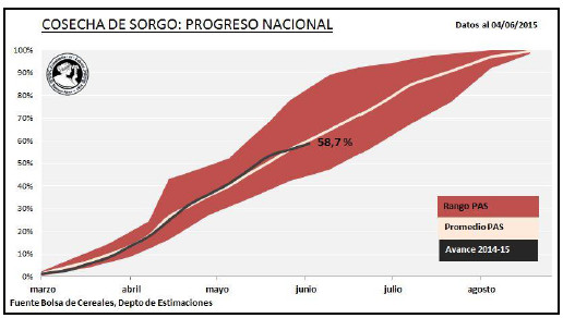 Continúan las tareas de recolección de sorgo a nivel nacional, ralentizadas por las lluvias ocurridas sobre el NEA hacia fines de mayo. El progreso acumulado de cosecha a la fecha es de 58,7 %, lo que en números absolutos representa 470.000 Ha.