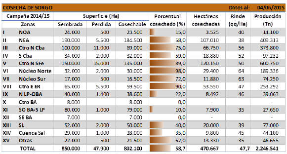 La región Núcleo Sur presenta un progreso del 72 %, con rendimientos que se mantienen en 63 qq/Ha. La vecina región del Núcleo Norte, con un 98 % de avance y 64 qq/Ha en promedio de rinde, espera la recolección de lotes puntuales para poder concluir la campaña sorguera.