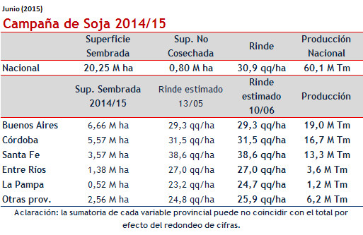En el tramo final de la cosecha de soja, con 600 mil hectáreas por levantar, se hicieron ajustes positivos en rindes, dando por resultado un promedio nacional récord de casi 31 quintales. De esta manera, la soja 2014/15 arrojaría una producción de 60,1 M de toneladas.