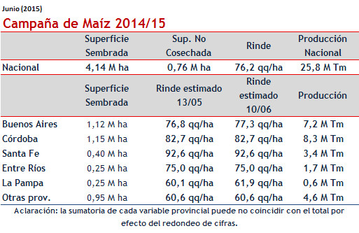 Con 56% de avance en las labores de cosecha en maíz, se ajusta también el número de maíz en 100 mil toneladas. Con un rinde nacional promedio de 76,2 qq/ha, se podría obtener una producción de 25,8 millones de toneladas en este 2014/15.