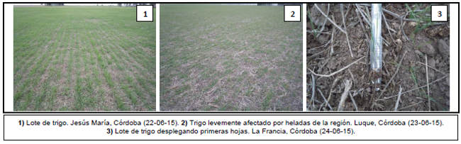 Hacia el Sur de Córdoba, la mayor parte del área implantada aún despliega sus primeras hojas, bajo condiciones hídricas regulares a escasas. Similar panorama fue relevado en las regiones Núcleo Norte y Sur, en donde los cuadros despliegan sus primeras hojas o aún se encuentran emergiendo, en lotes de regular a escasa oferta hídrica, promoviendo una condición del cultivo entre buena a regular. En áreas donde la humedad del suelo era adecuada, el nacimiento de los cuadros implantados en fechas tempranas fue rápido y homogéneo, promovido por las buenas temperaturas relevadas hasta principios de Junio.