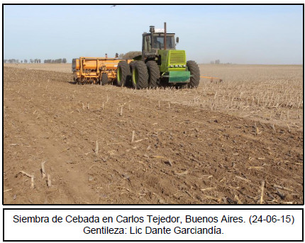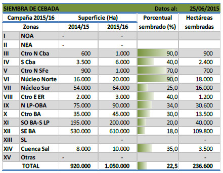 Finalmente las regiones Sudeste y Sudoeste de Buenos Aires-Sur de La Pampa registran un progreso de incorporación de 18 y 20 % respectivamente, valores levemente retrasados en comparación al ciclo previo. Estas demoras en las zonas núcleo cebaderas, podrían deberse a la incipiente falta de humedad superficial registrada. Sobre amplios sectores del sur bonaerense y pampeano la intención para esta campaña es incrementar la superficie destinada al cultivo de cebada en desmedro del trigo. En gran parte de los casos, el realizar una cebada de calidad cervecera les permitiría sobrepasar el rendimiento de indiferencia haciendo de este un cultivo atractivo.