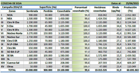 El descenso del promedio del rendimiento de los últimos días se debe al progreso de trilla registrado sobre lotes de primera implantados en fechas tardías, que presentan menores potenciales de rinde debido a su período de crecimiento y desarrollo más acotado. Bajo este escenario mantenemos nuestra proyección de producción en 25.000.000 de toneladas.