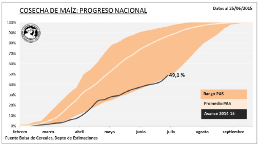 Luego de registrar un avance intersemanal de 6 puntos porcentuales, la cosecha nacional de maíz con destino a grano comercial logró cubrir el 49,1 % del área apta, permitiendo registrar un leve adelanto interanual de 0,5 puntos. El rinde medio nacional descendió a 86 qq/Ha (-1,1 qq/Ha versus informe previo) y luego de recolectarse más de 1,6 MHa, el volumen parcial acumulado supera las 13,8 MTn.