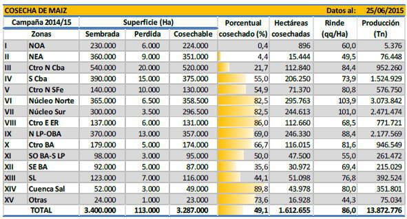 Durante los últimos siete días se relevó una mayor actividad de cosecha en amplios sectores de Córdoba, Centro-Norte de Santa Fe y en el Norte de La Pampa-Oeste y Centro de Buenos Aires. Las heladas registradas en todas estas regiones aceleraron el secado de los granos y permitieron reactivar la cosecha, principalmente en lotes implantados en fechas tardías. En la gran mayoría de los casos los rendimientos recolectados se mantuvieron dentro de las expectativas, sin embargo los primeros resultados relevados sobre lotes tardíos en la regiones NEA y Centro-Norte de Santa Fe, arrojaron productividades por debajo de lo previsto y habrá que esperar a que la recolección cobre impulso para precisar con mayor certeza los promedios que podrán alcanzar ambas regiones al cierre de campaña.