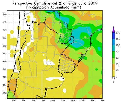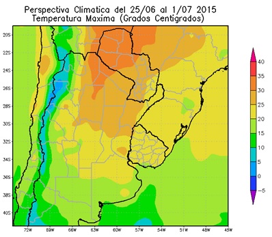 Al comienzo de la perspectiva arribarán los vientos del norte, provocando temperaturas máximas superiores a lo normal en la mayor parte del área agrícola, aportando abundante humedad atmosférica. El calor y la humedad aportados por los vientos del norte provocarán precipitaciones de frente caliente (o sea sin que baje la temperatura) sobre el este del área agrícola. Hacia finales de la perspectiva comenzará el paso de un frente frío, cuya primera manifestación consistirá en causar el descenso de la temperatura, al mismo tiempo que continuará produciendo lluvias.