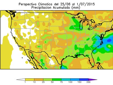 La perspectiva comenzará con precipitaciones sobre el centro y el este del área agrícola norteamericana, mientras que la mayor parte del oeste recibirá valores escasos. Paralelamente, se registrarán temperaturas máximas superiores a lo normal sobre la mayor parte del área agrícola norteamericana. Estas temperaturas causarán una elevada evapotranspiración que provocará un consumo de humedad superior al aporte de las lluvias. Posteriormente, se producirá la entrada de vientos del norte, que causarán un moderado descenso térmico. Esta evolución climática será acompañada por una serie de fenómenos extemporáneos, de considerable intensidad: Fuertes lluvias desde el valle de Ohio a la costa del Atlántico Medio, 26 a 27 de Junio; Calor excesivo para las partes del Atlántico Medio y el sudeste, 26 de junio; Temperaturas muy por encima de lo normal desde Utah hasta el oeste de Dakota del Norte, 1 a 2 de Julio; Posibles Inundaciones en partes del centro-este de los EE.UU.