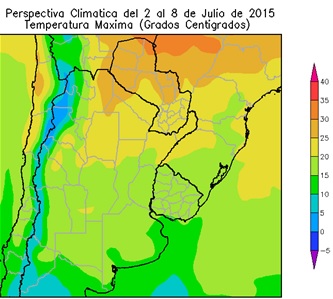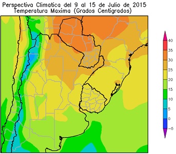 El este del NOA, el centro-sur y el este del Paraguay, la mayor parte de la Región del Chaco, el norte de la Mesopotamia y el extremo norte de la Región Pampeana observarán temperatura máximas entre 20 y 25°C. El centro del NOA, el este y el centro de Cuyo, la mayor parte de la Región Pampeana, el sur de la Mesopotamia y la mayor parte del Uruguay observarán temperaturas máximas entre 15 y 20 °C.