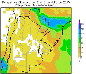 La mayor parte del Paraguay, la mayor parte de Misiones y el sur de la Cordillera observarán precipitaciones entre moderadas a muy abundantes (10 a 75 mm), con focos de tormentas con precipitaciones superiores a 100 mm. La mayor parte del área agrícola argentina y la mayor parte del área agrícola uruguaya, registrarán precipitaciones escasas (menos de 10 mm).