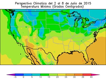 La mayor parte del área triguera y la mayor parte del cinturón maicero, experimentarán temperaturas mínimas entre 10 y 15°C. La mayor parte de Kansas, el nordeste y el noroeste de Oklahoma, el norte del Delta y el sur del cinturón maicero, observará temperaturas mínimas entre 15 y 20ºC. El sur del área triguera, la mayor parte del Delta y la mayor parte de la Región Sudoeste observarán temperaturas mínimas superiores a 20°C, con focos con valores mayores.