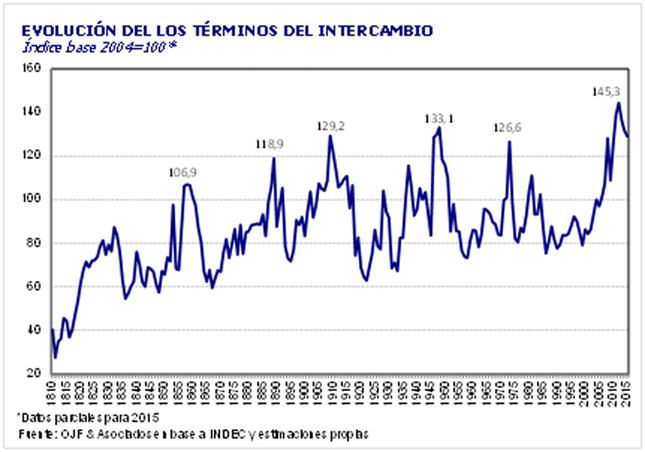 Como puede verse, no hay una caída secular de los términos del intercambio, sino que éstos presentan ciclos, que suelen acentuarse por circunstancias internacionales. También a la salida de la segunda Guerra Mundial se produjo un fuerte aumento de nuestros términos de intercambio, por la gran demanda de alimentos, producto de la gran masa de recursos aportados por el Plan Marshall para la reconstrucción de Europa. En esa oportunidad, nuestro gobierno de aquella época creó el IAPI (Instituto Argentino para el Intercambio) y se apropió de la gran diferencia de precios dado que solo pagó una pequeña parte del gran incremento de los precios internacionales de los alimentos a los productores locales. Distribuyó también el excedente de recursos, creándose con esa gran masa de fondos un movimiento político que dura hasta el presente, el peronismo.