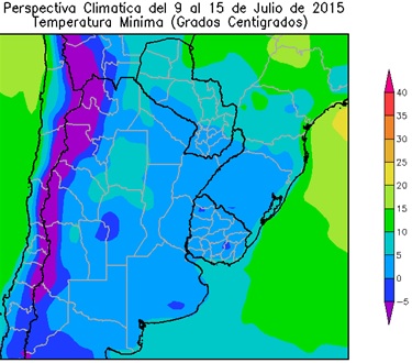 Al inicio de la segunda parte de la perspectiva continuarán soplando los vientos del sector sur, llegados durante la primera etapa, aunque con intensidad algo menor. La mayor parte del Paraguay, el este de Salta, la mayor parte de la Región del Chaco, la mayor parte de Santiago del Estero, el norte de Córdoba, el norte de Cuyo, el norte de la Mesopotamia, el sur de Santa Fe, el este del Uruguay, y el este de Buenos Aires observarán temperaturas mínimas superiores a 5°C, con leve riesgo de heladas localizadas, con un foco con temperaturas superiores sobre el norte del Paraguay.