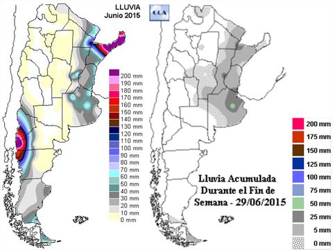 De a poco se han ido ajustando los contenidos de humedad en los niveles superficiales. Las lluvias de las últimas semanas no lograron alcanzar a muchas zonas que siguen exhibiendo falta de agua. El centro y norte del oeste santafesino, gran parte de Córdoba, el extremo sur de Buenos aires y amplias zonas de La Pampa están con déficits de humedad y dado el típico patrón de lluvias invernal, es difícil prever una rápida recuperación de las reservas mientras el tiempo de siembra va en descuento. Sin lluvias, mayo estuvo dominado por una altísima humedad atmosférica que se extendió sobre parte de junio. Con el progreso del mes entraron las primeras heladas al centro de la región pampeana y se acentuó la falta de agua. Luego de casi dos meses sin lluvias significativas en muchas áreas de la región, las precipitaciones se presentaron finalmente en estas últimas semanas beneficiando el margen este del país. Esto se observa en la imagen de la Consultora de Climatología Aplicada -CCA-.