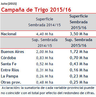 Si bien los guarismos de superficie del trigo 2015/2016 seguirán revisándose mensualmente, hasta llegar a la configuración final, en el presente informe se estima un área total de 3,5 millones de hectáreas, lo cual es un 20% menor a los 4,4 millones de hectáreas cultivadas en la campaña anterior.
