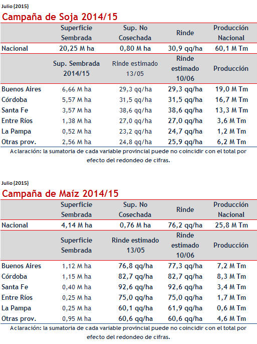 Las productividades para soja y maíz del ciclo 2014/15 quedan resumidas en los siguientes cuadros: