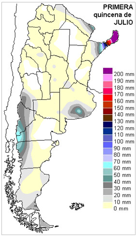 Lo más destacado del mapa se concentra en la provincia de Misiones donde las lluvias de la primera quincena ya han superado los 200 milímetros, con picos que casi duplican esta marca en el norte de la provincia (superan largamente la escala del mapa). Estas importantes precipitaciones han decantado en forma marginal al norte de Corrientes, para luego presentarse un rápido gradiente hacia las lluvias modestas que se han venido observando en la región pampeana. Las extraordinarias lluvias de Misiones, forman parte de un área mucho más vasta que incluye toda la zona del pantanal brasileño y gran parte de la franja agrícola del este de Paraguay, donde se complican las tareas de cosecha de maíz de segunda y el trigo florece complicado por los excesos.