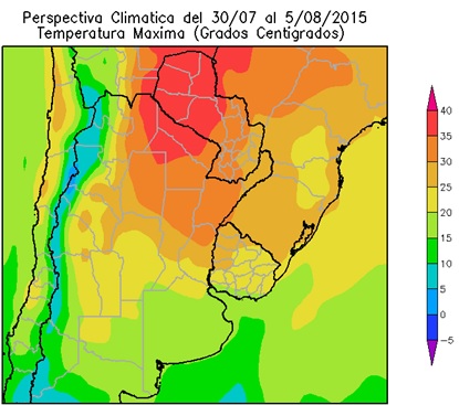 Al comienzo de la perspectiva continuarán soplando los vientos del sector norte, incrementando la temperatura, el contenido de humedad de la atmósfera y la nubosidad por encima de lo normal en la mayor parte del área agrícola. El este de Salta, el este de la Región del Chaco, el norte de Santa Fe, Corrientes, el norte de Entre Ríos y el sudeste del Paraguay, experimentarán temperaturas máximas superiores a 30°C, con amplias extensiones con registros de más de 35 °C.