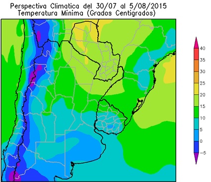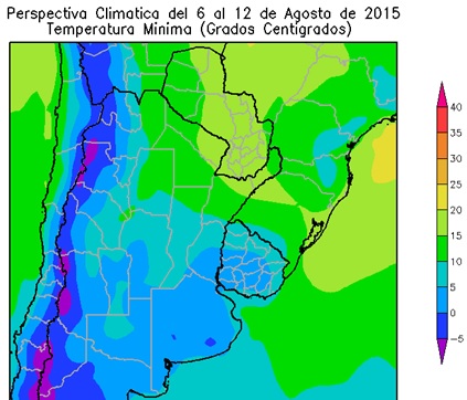 El centro del NOA, el norte de Cuyo, la mayor parte de Córdoba, de Santa Fe, de Entre Ríos, el norte de La Pampa, el este de Buenos Aires y el norte y el sudeste del Uruguay, observarán temperaturas mínimas entren 5 y 10°C. El centro-oeste del NOA, la mayor parte de Cuyo, la mayor parte de la Región Pampeana y la mayor parte del área agrícola uruguaya, observará temperaturas mínimas entre o y 5ºC.