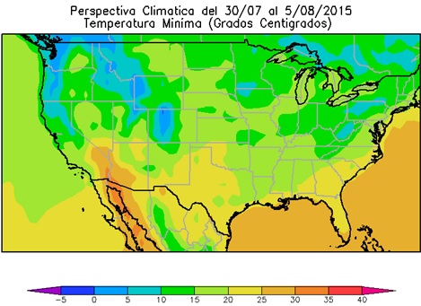La perspectiva comenzará con vientos del norte, que provocarán un descenso térmico de corta duración en el norte y el centro del área agrícola norteamericana, mientras que su extremo sur seguirá bajo la influencia de los vientos del trópico. Los vientos del sur, retornarán rápidamente, provocando un marcado ascenso térmico, que provocará una ola de calor sobre gran parte del área agrícola norteamericana. El norte del área triguera, la mayor parte del cinturón maicero y el norte de la Región del Sudeste, observará temperaturas mínimas superiores a 10°C, con algunos focos con valores inferiores, con leve riesgo de heladas localizadas.