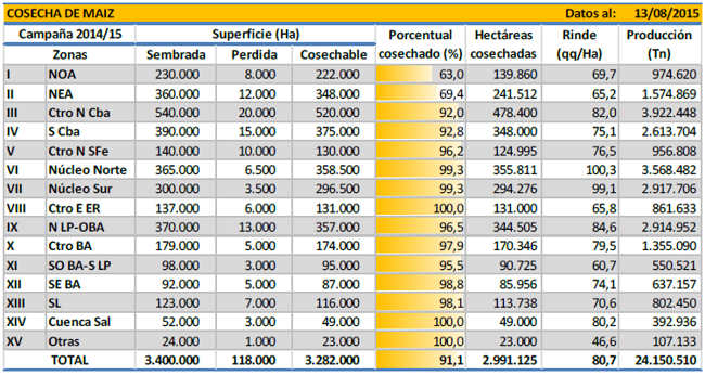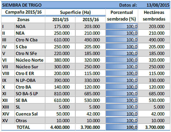 Durante los últimos días, las lluvias registradas en amplios sectores del territorio nacional provocaron una pausa en las labores de recolección del cereal. Este fenómeno climático genera un aumento en la humedad de los cuadros todavía en pie y, por otro lado, dificulta la trilla por falta de piso en sectores anegados o con presencia de napas altas. Nuestro informe agroclimático estacional, pronostica que continuarán las condiciones atmosféricas inestables en este final del invierno. De concretarse este panorama, la cosecha se extendería hasta principios de septiembre, momento donde comenzara en paralelo la siembra de la nueva campaña 2015/16.