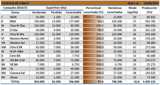 A pesar de las condiciones climáticas inestables registradas durante los últimos días sobre el centro del área agrícola, la cosecha de sorgo granífero avanzó con fluidez sobre sectores del norte y oeste nacional. De este modo, el progreso acumulado de cosecha alcanzó el 97,6 % de la superficie apta, lo que en números absolutos son alrededor de 749.000 Ha. El rendimiento promedio se calcula en 45,8 qq/Ha y el volumen acumulado en chacra se encuentra próximo a las 3.430.000 toneladas. Bajo este panorama mantenemos nuestra proyección de producción para la campaña 2014/15 en 3.500.000 toneladas, cifra que representa una caída interanual del -18,6 % (campaña 2013/14: 4,3 MTn).