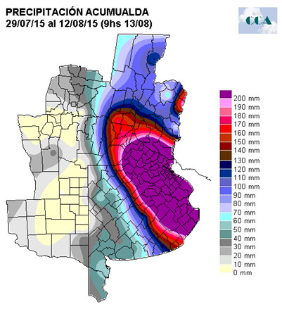 El mapa que muestra el acumulado pluvial de las últimas dos semanas es muy elocuente, enfatizando con registros que superan largamente los 200 milímetros, el epicentro pluvial en el noreste de BA. Estas marcas son al menos 5 veces superiores a los valores normales del mes de agosto.
