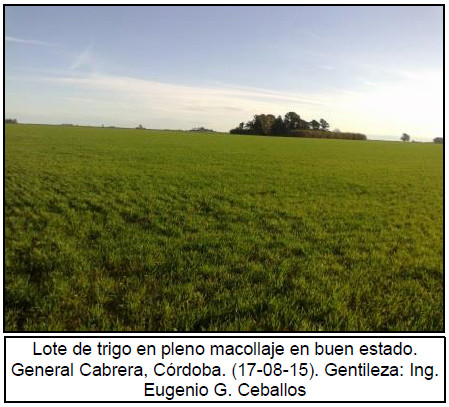Hacia el Sur de Córdoba, la oferta hídrica es adecuada en gran parte del área implantada. El cereal transita estadios de macollaje, en condición buena a muy buena, no obstante parte del área aún mantiene expectativas de cumplir solo la función de cultivo de cobertura. Sobre el centro-norte de la provincia, las últimas lluvias relevadas mejoraron notablemente la condición del cultivo y los cuadros más adelantados transitan etapas críticas de encañazón. En la región Núcleo Norte, la oferta hídrica es óptima y los cuadros se encuentran macollando, sosteniendo una condición de cultivo de buena a muy buena. Hacia el Centro-Este de Entre Ríos el cultivo transita etapas de encañazón, mientras que una menor proporción de lotes aún se encuentra macollando. La condición del cultivo es muy buena.