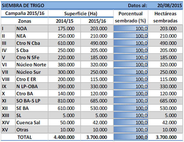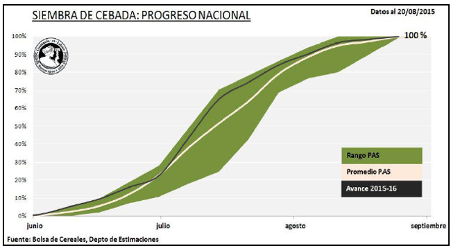 Han culminado las labores de incorporación de cebada a nivel nacional, con los últimos cuadros sembrados sobre el Sudeste de Buenos Aires, la Cuenca del Salado y el Sudoeste de Buenos Aires-Sur de La Pampa. Al incorporarse estos últimos lotes, se logró alcanzar el área estimada para esta campaña en , 1.050.000 hectáreasreflejando un incremento interanual del +14,1 % (Campaña 2014/15 920.000 Ha).