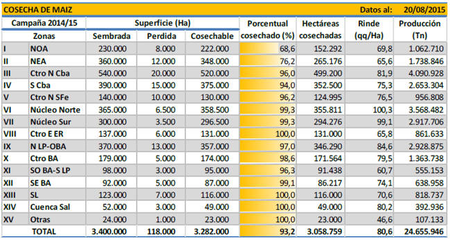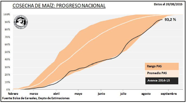 La recolección de maíz con destino grano comercial logró cubrir el 93,2 % de la superficie apta, registrando un rendimiento promedio de 80,6 qq/Ha y permitiendo acumular un volumen parcial de 24,6 MTn en chacra. El avance intersemanal fue de 2,1 puntos porcentuales, concentrándose los mayores progresos nuevamente en las regiones del norte del área agrícola. En comparación a la campaña 2013/14, la recolección registra un retraso interanual de -1 punto porcentual. Este retraso está vinculado a las precipitaciones ocurridas en gran parte de territorio nacional la última semana, que no permitieron cobrar fluidez a las labores de cosecha. Frente a este panorama mantenemos nuestra proyección de producción en 26.000.000 de toneladas para la campaña en curso.