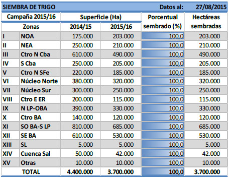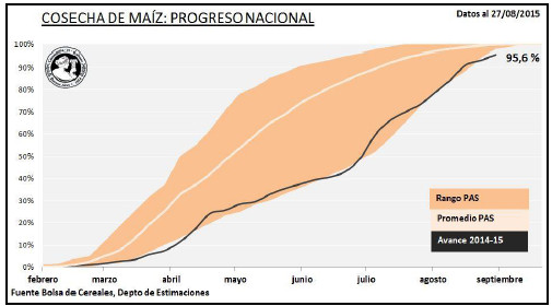 A pesar de las buenas condiciones climáticas de los últimos días, las lluvias registradas sobre el territorio nacional durante principios de agosto siguen afectando amplios sectores del margen este del área agrícola. Este fenómeno climático generó un aumento en la humedad de los cuadros todavía en pie y, por otro lado, paralizó la trilla por falta de piso en sectores anegados o con presencia de napas altas. Este retraso en la cosecha de los lotes tardíos, en zonas como el Centro-Norte de Santa Fé, generó una superposición de campañas, ya que lentamente comenzó la siembra temprana de los primeros cuadros del nuevo ciclo 2015/16.