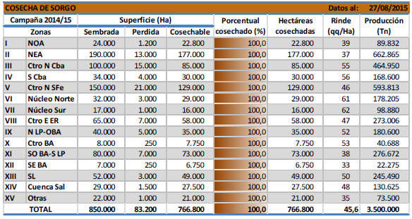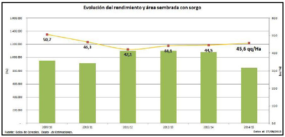 Ha concluido la cosecha nacional de sorgo granífero de la campaña 2014/15. Luego de recolectarse una superficie de 767 mil hectáreas, el rendimiento promedio nacional se ubicó en 45,6 qq/Ha y la producción alcanzó las 3.500.000 toneladas. Esta cosecha se sitúa un -18,6 % por debajo de la producción acumulada en la zafra pasada, y es la menor de los últimos 5 ciclos. Las pérdidas de área estimadas alcanzan las 83.200 hectáreas, cifra que equivale al 9,8 % de la superficie sembrada.