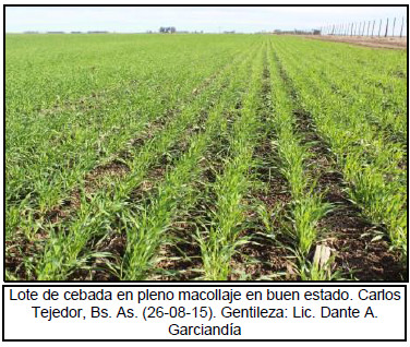 El cese de las lluvias y las mejores condiciones climáticas han permitido el reingreso a los cuadros afectados. Hacia la Cuenca del Salado, región más afectada por los excesos, se estima una pérdida preliminar de alrededor del 35 % de los cuadros sembrados. Sobre el Centro de Buenos Aires la situación es variable, hacia el este de la zona hay pérdidas cercanas a las halladas en la Cuenca del Salado, sin embargo el cultivo de cebada cobra preponderancia hacia localidades como Bolívar, Henderson y Daireaux, en las cuales la situación es mucho mejor gracias al drenaje más rápido de los suelos y al menor volumen de precipitaciones ocurrido. En ambas regiones el cultivo se encuentra transitando el estadío de macollaje y la condición del mismo va desde mala, en cuadros con excesos sobre la región de la Cuenca, hasta muy buena para lotes en lomas arenosas del Centro de Buenos Aires.