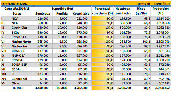 Puntualmente en la zona del NOA, se ha cosechado el 90 % del área apta, registrando un avance intersemanal de 13,8 puntos porcentuales gracias a las buenas condiciones climáticas de los últimos días. El rinde medio se ubica en torno a los 69,8 qq/Ha, el cual se proyecta como uno de los más altos de los últimos ciclos. En paralelo, sobre la región NEA, se ha recolectado el 95 % de la superficie, con un rinde promedio de 66,3 qq/Ha. Sobre la región del Centro-Norte de Santa Fe se dan por finalizadas las labores de recolección, restando trillar solo lotes puntuales provenientes de siembras de segunda ocupación que no representa un área significativa. El rinde promedio de esta campaña 14/15 se ubicó en los 76,4 qq/Ha.
