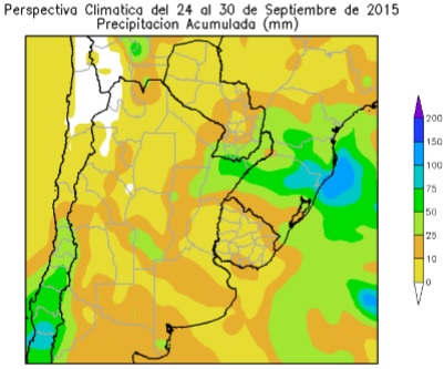 Al comienzo de la perspectiva, el norte del área agrícola recibirá vientos del sector norte provocando el aumento de la temperatura, mientras que el sur y el centro-este observarán registros moderados debido al ingreso de vientos del sur. Paralelamente, se producirá el paso de un frente de tormenta cuya actividad se concentrará sobre el sudoeste y el nordeste del área agrícola, mientras que el resto de su extensión no registrará meteoros significativos. El comienzo astronómico de la primavera tendrá lugar el 23 de Septiembre, coincidiendo con la entrada de una masa de aire proveniente del sudoeste, que provocará un marcado descenso de la temperatura, con riesgo de heladas en todo el oeste, el centro y el sur del área agrícola.