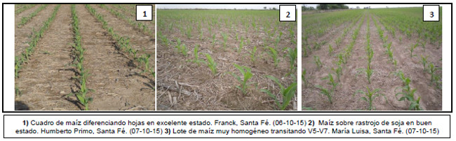 En la región Centro-Norte de Córdoba y Núcleo Norte, donde se lograron muy buenas implantaciones, los cuadros ya incorporados se encuentran transitando etapas de diferenciación foliar (V4-V6), bajo condición de humedad regular y sanidad óptima.