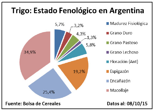 En los núcleos trigueros del nuestro país, ubicados sobre el Sudeste y Sudoeste de Buenos Aires, una gran proporción de lotes aun transita etapas de macollaje, mientras que un escaso porcentaje del área comienza a encañar bajo condiciones hídricas favorables. En ambas regiones se realizaron prácticas de refertilización, aunque en dosis muy variables y en términos generales se releva una caída en el uso de tecnología aplicada para el cultivo.