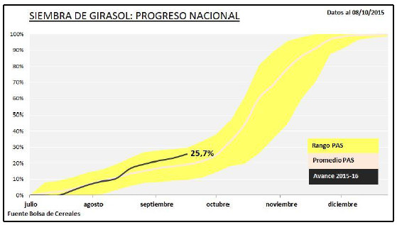 Durante los días previos a este informe, la siembra de girasol avanzó lentamente sobre el sector sur del área agrícola nacional. En números absolutos ya se han incorporado más de 370.000 hectáreas, permitiendo calcular un progreso en la implantación a nivel nacional del 25,7 % sobre una superficie proyectada en 1.450.000 hectáreas. A su vez, se registró un avance intersemanal de 1,5 puntos porcentuales y un adelanto interanual en la siembra de 3,2 puntos.