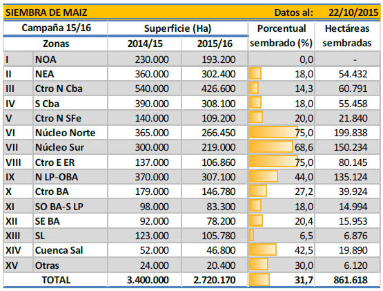 Durante la última semana continuó la incorporación de lotes de maíz con destino grano comercial, correspondiente a la campaña 2015/16, y los mayores progresos de siembra se concentraron en el sur del área agrícola nacional. Ya en el final de la ventana óptima para la incorporación de lotes tempranos en la zona núcleo maicera, los productores se encuentran evaluando la superficie que destinarán a maíces tardíos y/o de segunda ocupación.