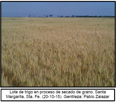 Hacia el Oeste de Buenos Aires y Norte de La Pampa se encuentran los cuadros con mayor estado de desarrollo. En esta zona las siembras tempranas ya inician etapas de llenado del grano, mientras que un gran número de lotes se encuentran espigando, en ambos casos favorecidos por las recientes lluvias registradas. Sobre el centro de la región agrícola nacional, en la provincia de Córdoba la mayor parte del área sembrada se encuentra transitando etapas de llenado del grano, en condiciones hídricas deficitarias sobre el Centro-Norte de la provincia, mientras que el sur se vio recientemente favorecida por precipitaciones de variable intensidad.